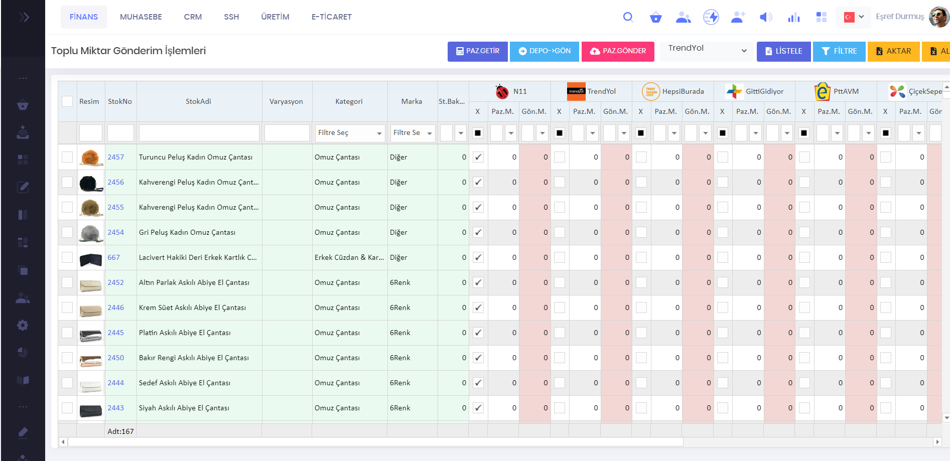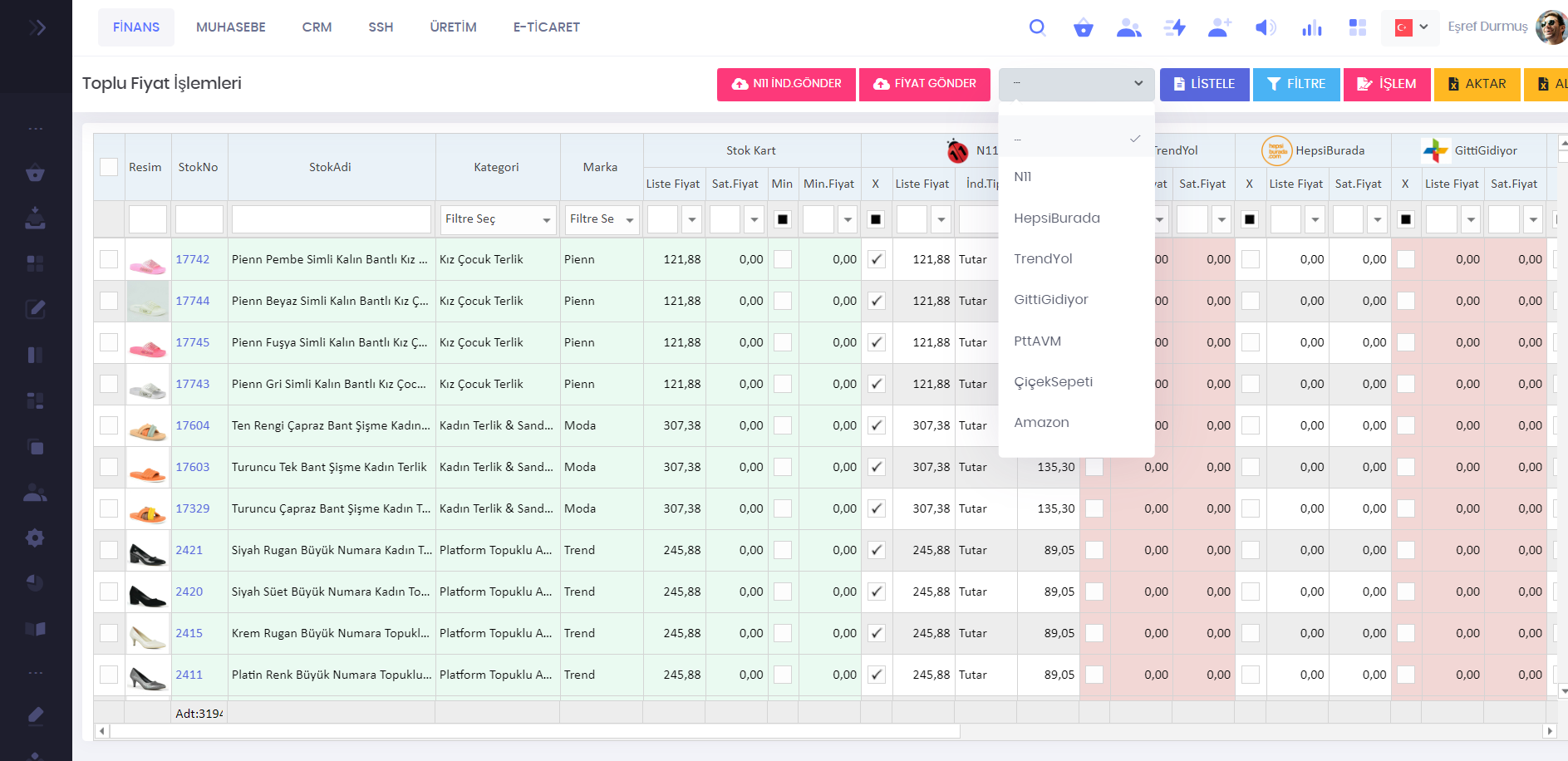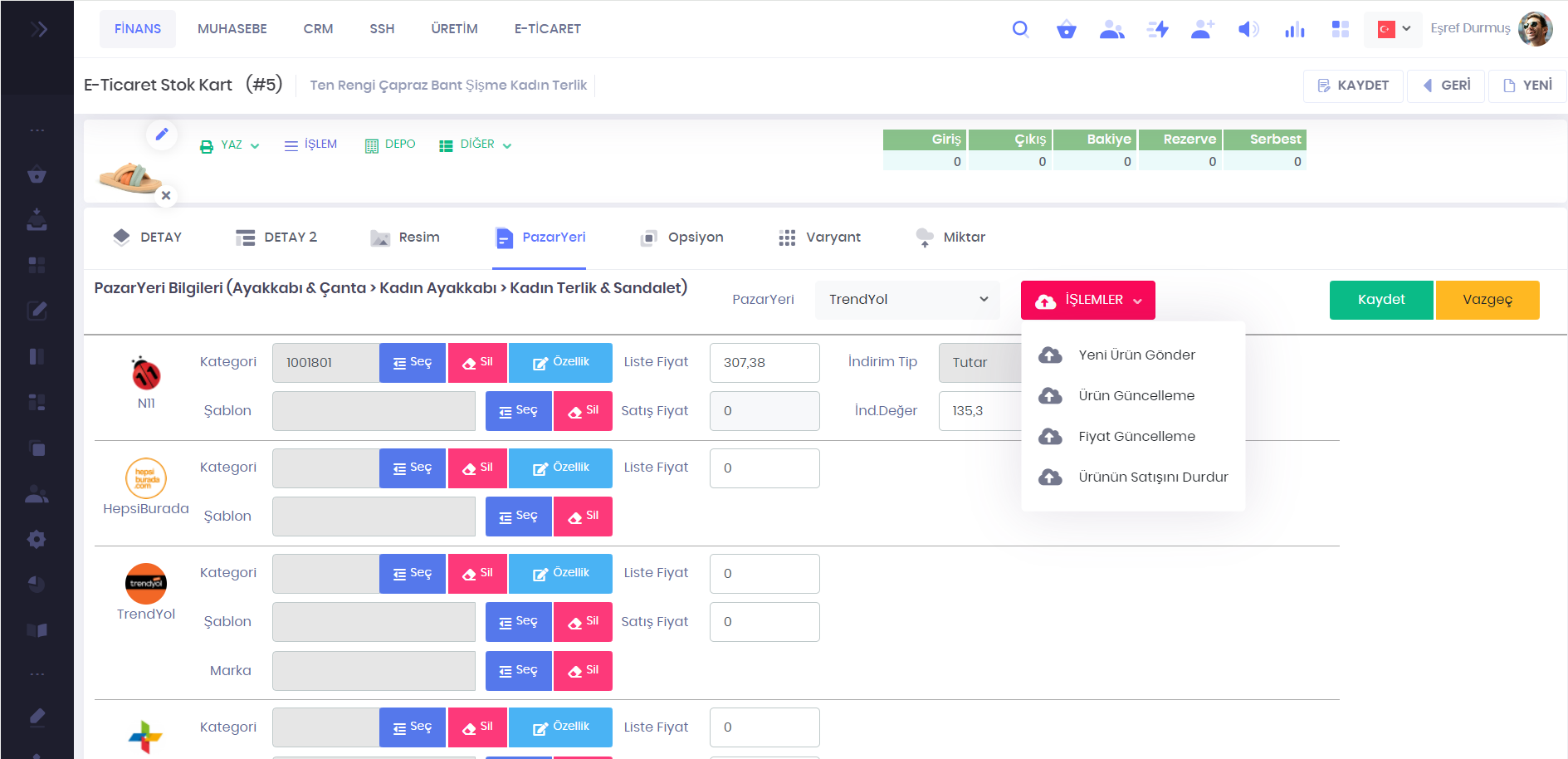 Yeni ürün gönderimi, ürün güncelleme, fiyat ve indirim güncelleme, ürün satış başlatma ve durdurma işlemleri yapılabilir.