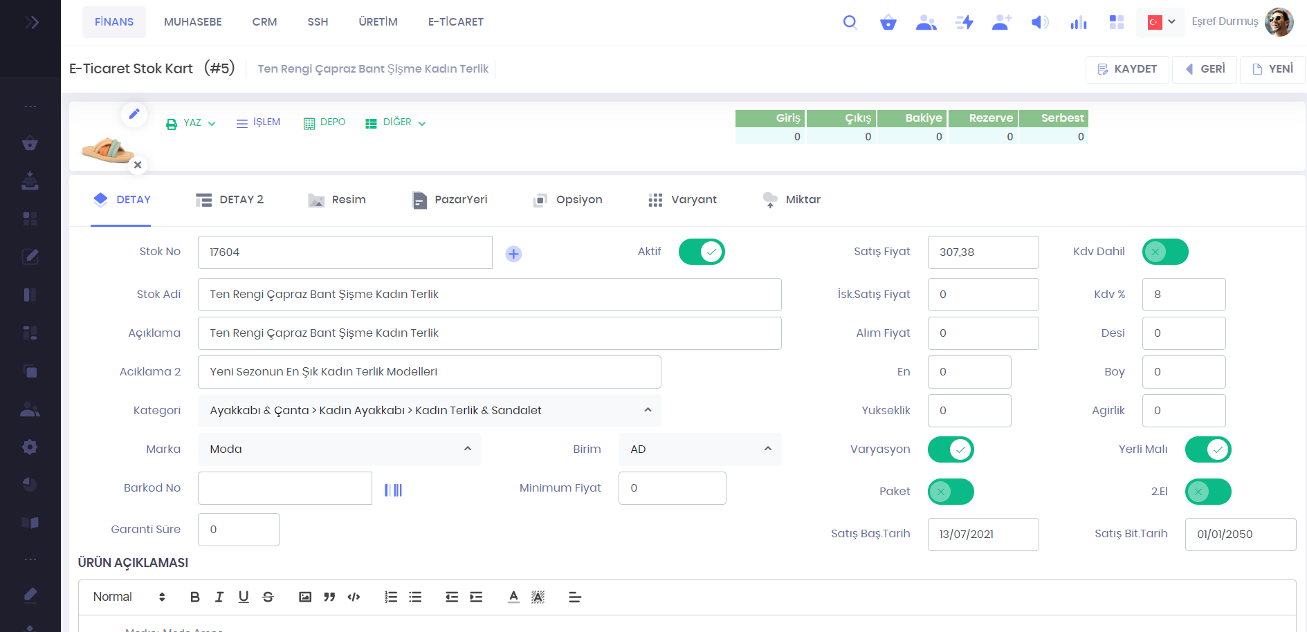 Kullanım kolaylığı için pazaryerine ait stok kart tanımları ayrıca bu ekranda görüntülenir. Pazaryeri için önceliği olan bilgi sahaları göz önüne alınarak tasarlanmıştır.