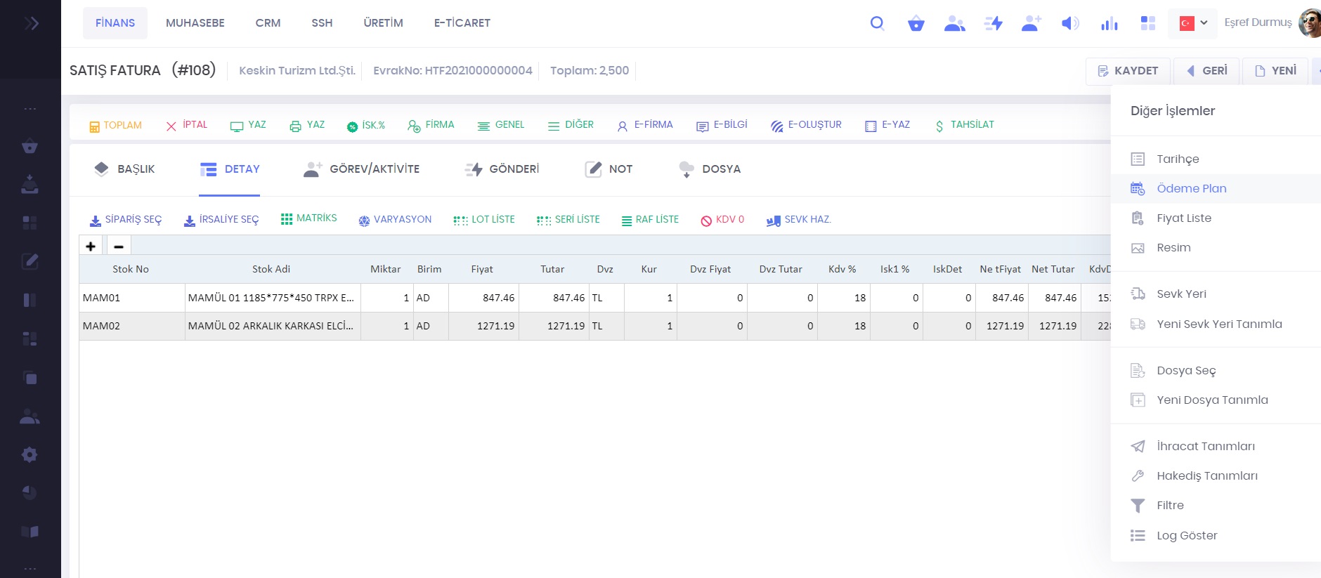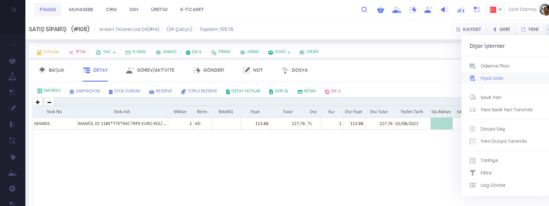 Fatura ve Siparış fişlerinde olduğu gibi Tarihçe, Kayıt bazında filtre, Log kayıtları, ödeme planı, fiyat liste seçimi, sevk yeri tanımı, dosya tanımları gibi bir çok özelliği barındırır.