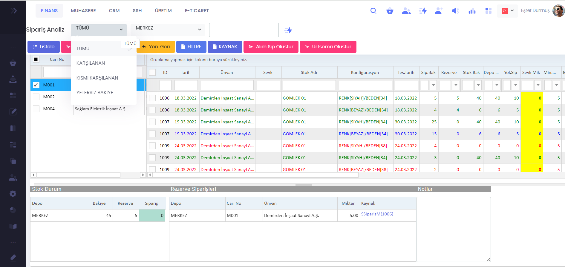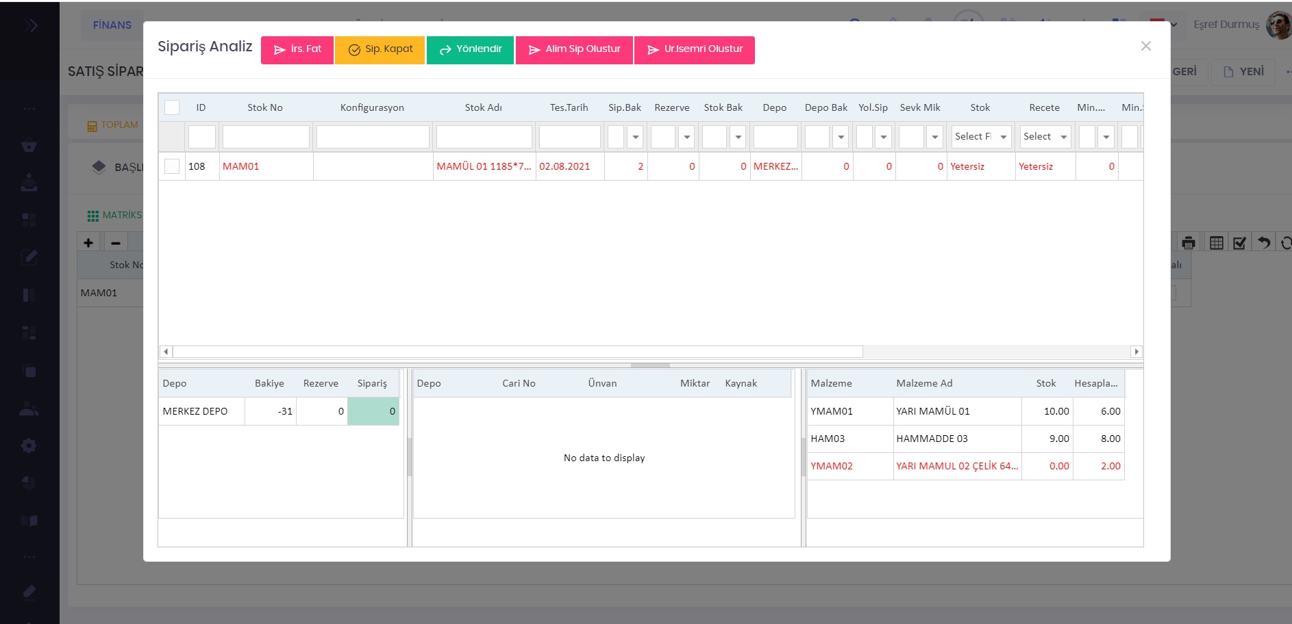 İlgili Siparişlerin Depo stok durumu, Yoldaki alım sipariş miktarları gibi bir çok gerekli bilgiyi görüntüler. İrsaliye, Fatura veya sevk fişleri oluşturabilir. Farklı şube depo durumları ve rezerve miktarlarını görüntüler. Farklı şubelere yönlendirme, Alım sipariş ve üretim işemirleri oluşturabilir.