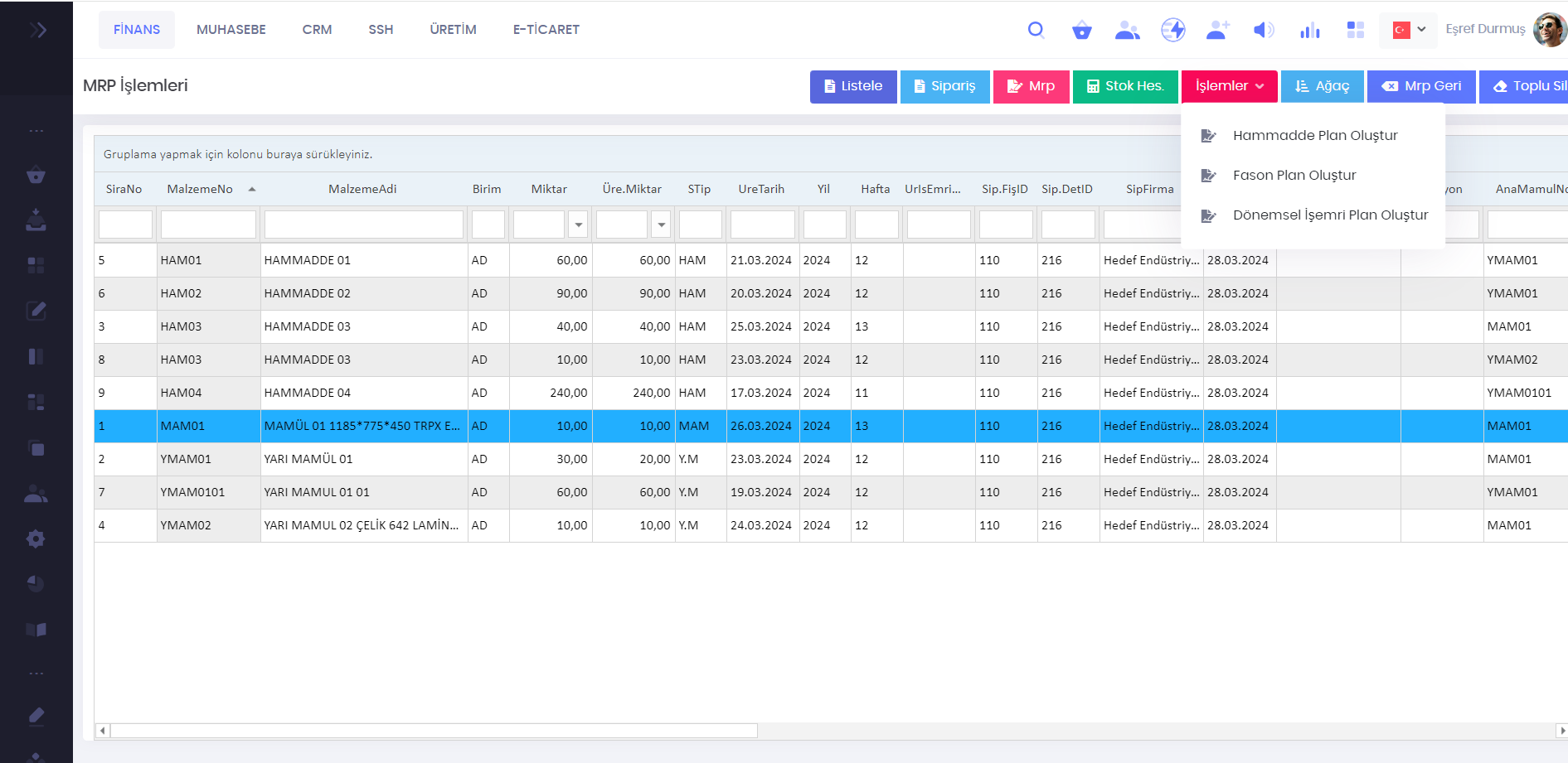 İstenilen siparişler seçilerek MRP hesaplaması yapılabilir. Bu hesaplama sonucunda hammadde plan, fason plan ve kendi üretimimiz için dönemsel işemri plan oluşturulabilir. Bu planlar miktarsal bilgileri içermesinin yanında gerekli olan tarihsel hesaplamayıda yapar. İşemri plandan otomatik olarak işemirleri oluşturulabilir.