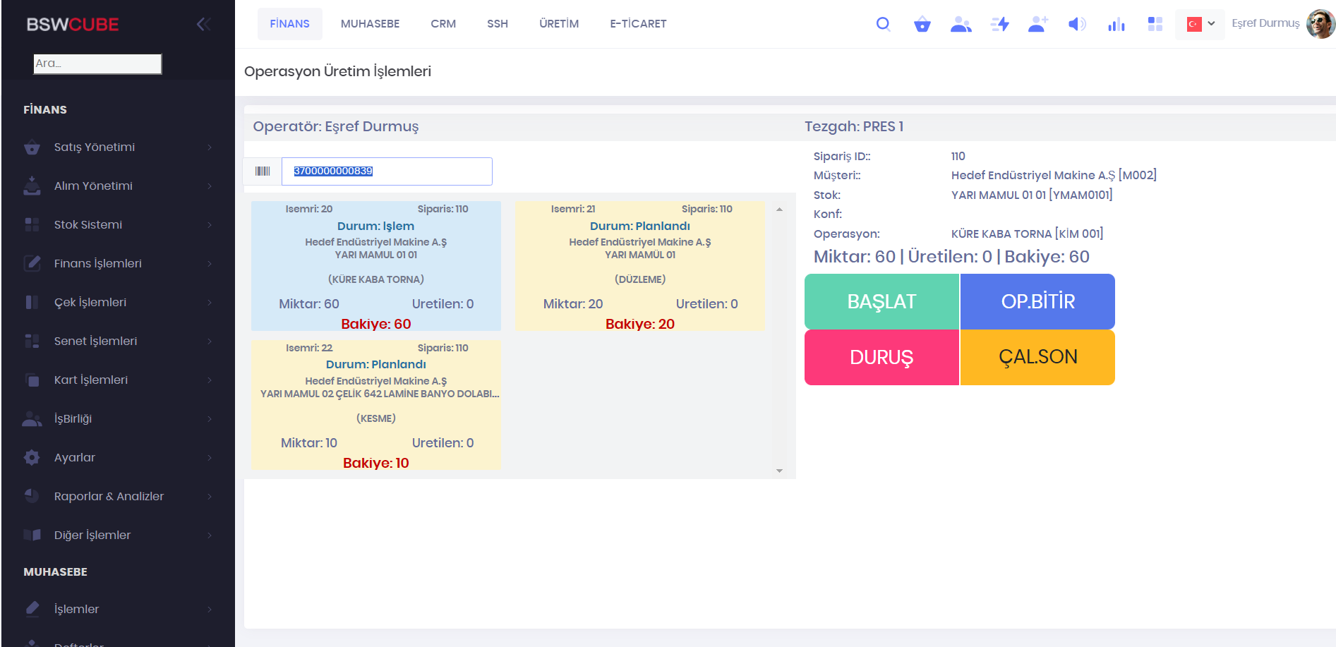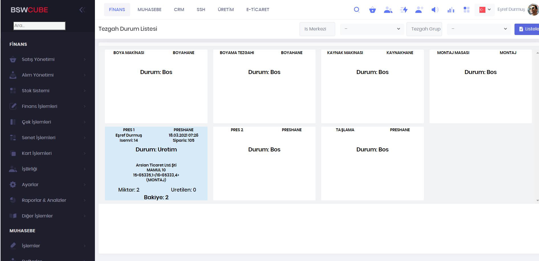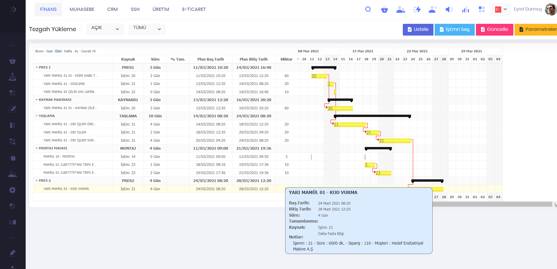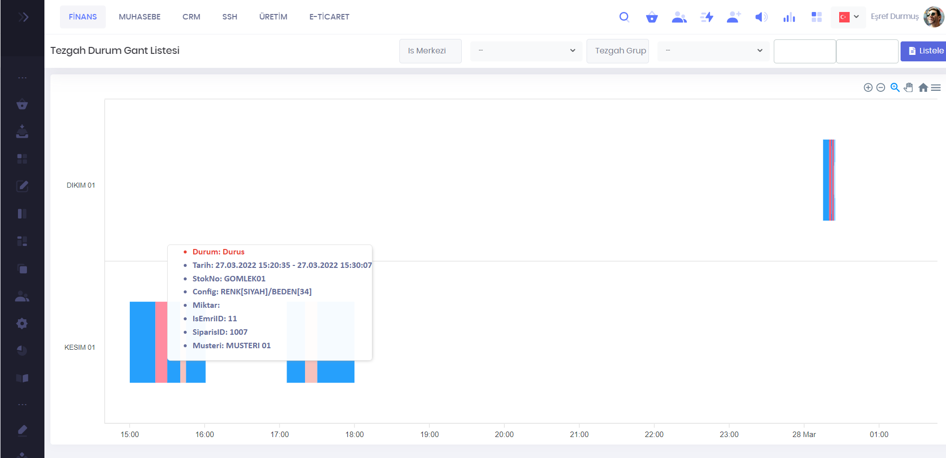 Tezgahların o anki durum bilgileri listelenir. Hangi sipariş, işemri, müşteri, planlanan miktar, üretilen miktar, bakiye ve tezgahon durumu görüntülenir.
