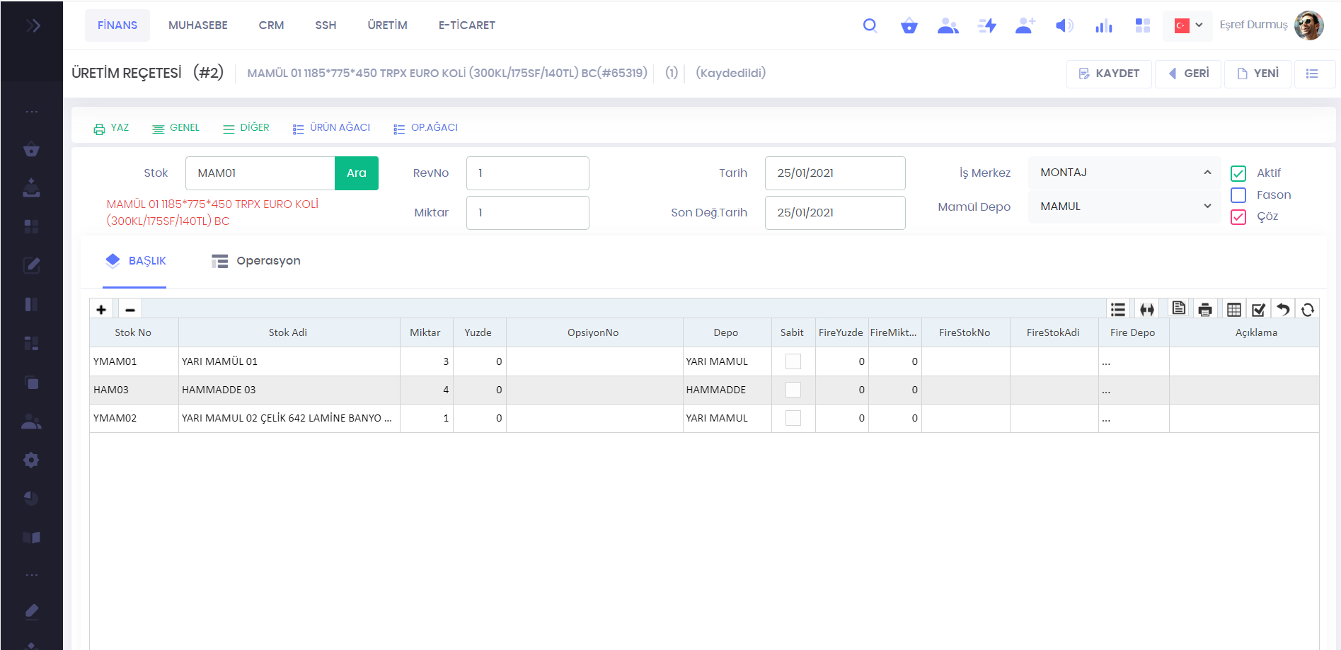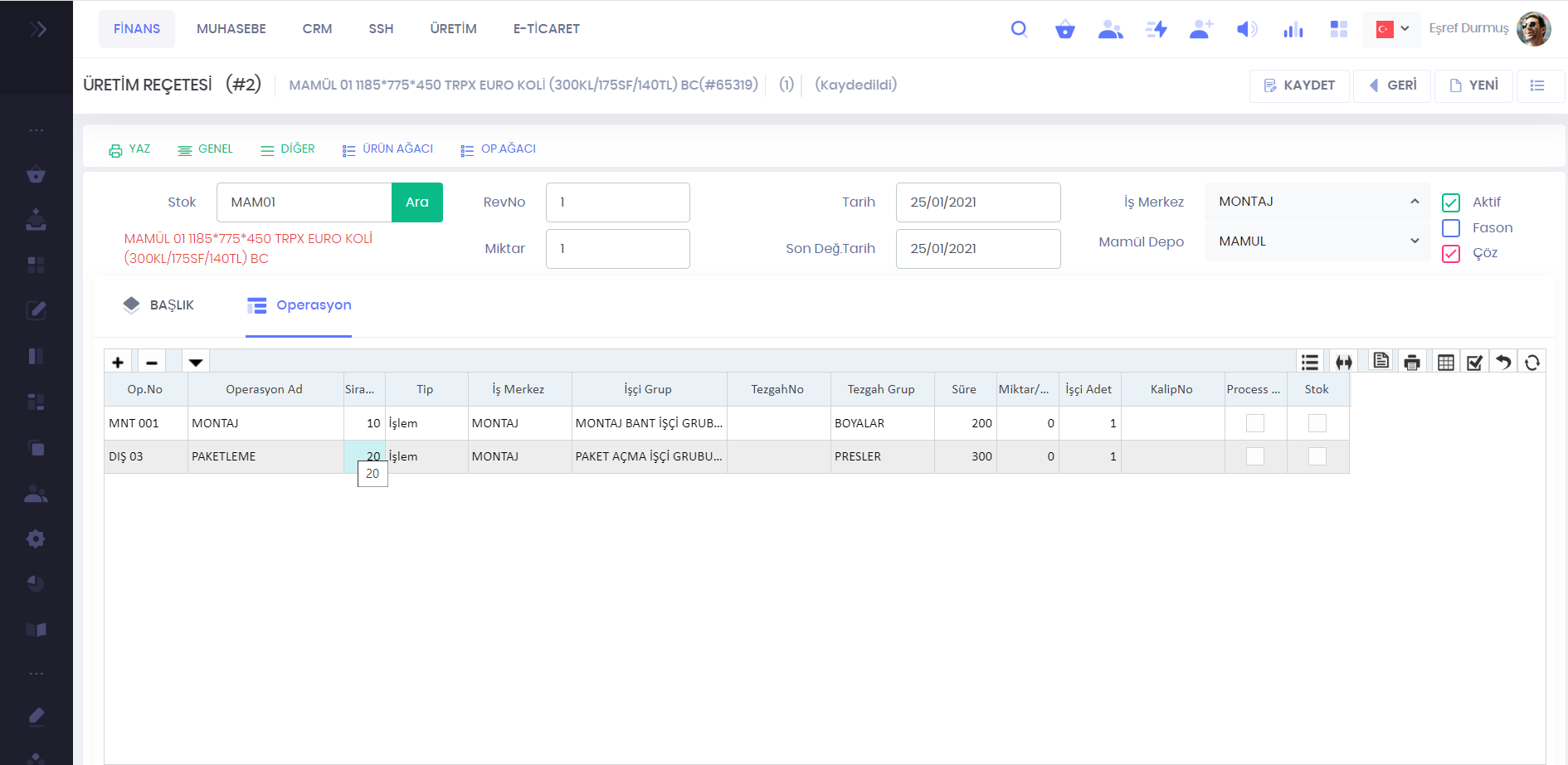 Ürün Reçetesi - Operasyon