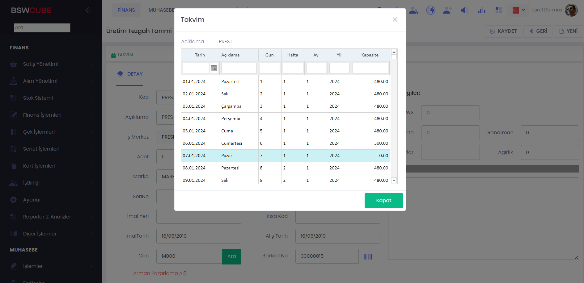 Üretim Tezgah - Takvim